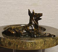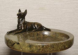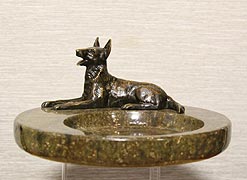 Представленная массивная визитница (лоток под мелочь) с фигуркой овчарки несомненно придаст интерьеру индивидуальность и стиль. На рубеже XIX-XX веков большой популярностью пользовались предметы интерьера, украшенные подобным бронзовым декором. Это могли быть затейливые литые элементы фурнитуры, или, как в данном случае, различные тематические статуэтки или фигурки в анималистическом жанре. Появилось устойчивое понятие - кабинетная бронза. Особенно преуспели в этой области венские мастера, которые производили широкий спектр кабинетных украшений: письменные приборы, настольные лампы, звонки, каминные принадлежности, визитницы, часы и т.п. Такие предметы венской бронзы создавали неповторимый шарм респектабельным кабинетам, подчеркивали статус и род занятий владельцев.
